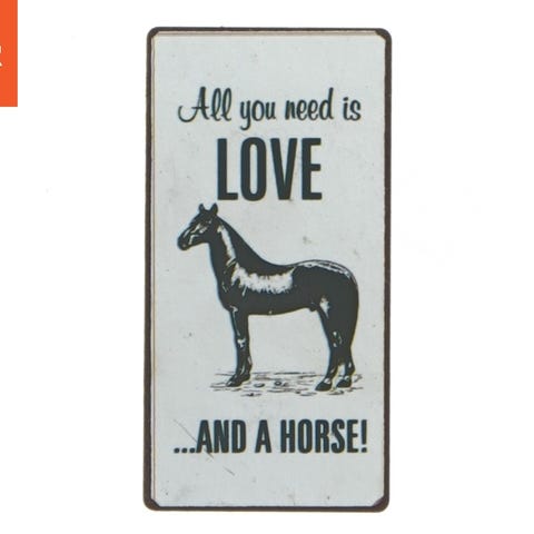 Dette er et lille metal skilt med dimensioner 10x5 cm. Foran på skiltet er der en tekst, der siger 'All you need is love...and a horse!'. Der er også en illustration af en hest. Bagsiden af skiltet er sort og indeholder en stregkode samt et logo fra Lafinesse.eu.
