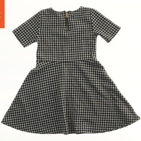 Kortærmet rød kjole lavet af et skinnende materiale. Kjolen har en rund halsudskæring og en dekorativ sløjfe på venstre skulder. Designet er enkelt med en let figursyet pasform, der når til omkring knæene. Egnet til cirka 4 til 6-årige børn.