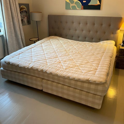Hästens Suprema senge i klassisk ternet design. Sengen fremstår som en dobbeltseng med boxmadras og helt ny BJX topmadras. Sengen giver et enkelt, tidløst udtryk i rummet. Yderligere mål 2 x 90 cm x 200 cm medium hårdhed på begge madrasser. Meget velholdt og står i flot stand.
