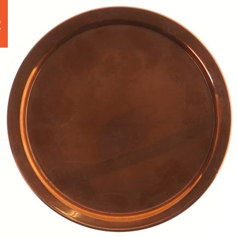 Dette er et rundt keramisk fad med en diameter på 35 cm. Fadet har en unik kunstnerisk glasur i nuancer af beige, grøn og blå, hvilket giver det et organisk og håndlavet udseende. Bagsiden har en mørk brun, ru overflade.