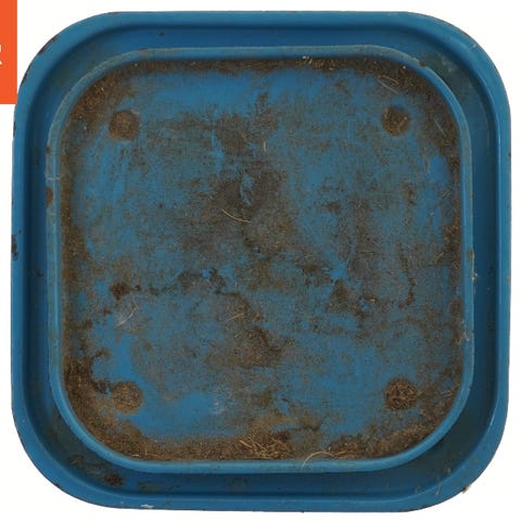 En firkantet retro bakke med afrundede kanter og et farverigt geometrisk mønster i midten. Bakken er domineret af orange farve med gule, hvide og rosa detaljer. Den viser tegn på brug med ridser og slid på overfladerne.
