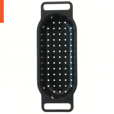 Køkken dørslag i blå emalje med sort håndtag og støttebøjle. Designet med cirkulære perforeringer for effektiv dræning. Diameteren er 21,5 cm, velegnet til at skylle og dræne ingredienser som pasta og grøntsager. Den lange sorte håndtag giver ekstra greb og stabilitet under brug.