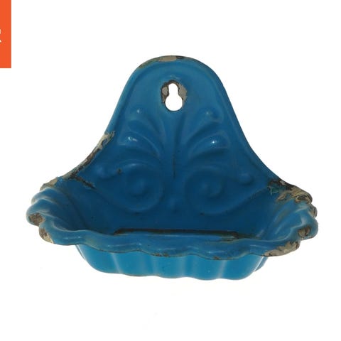 Denne vintage sæbeskål er designet til vægmontering og har en størrelse på 14x10x10 cm. Den er lavet af metal og er blå farve med små huller i bunden for dræning. Skålen har en dekorativ bagplade med en opadvendt kurveform og et hul til ophængning.