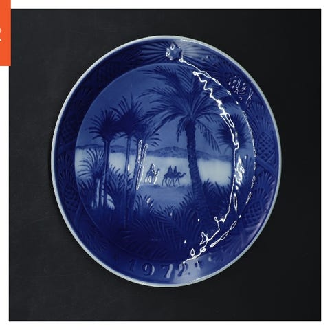 En lille firkantet porcelænsplatte med motiv af en rytter på en hest, omgivet af træer og et hegn. Platten har en malet blå scene på forsiden. Bagsiden har inskriptionen 'Kongens Nytorv' samt mærker fra Royal Copenhagen. Størrelsen er 12,5x12,5 cm.