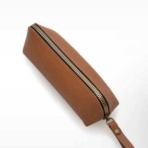 Tasken er dekoreret med et mønster af blomster i lilla nuancer. Den har en lynlåsåbning øverst og indvendige rum med en lille lomme til opbevaring. Dimensionerne er 23,5x11,5 cm, hvilket gør den velegnet til små genstande eller til brug som penalhus.