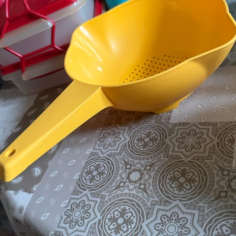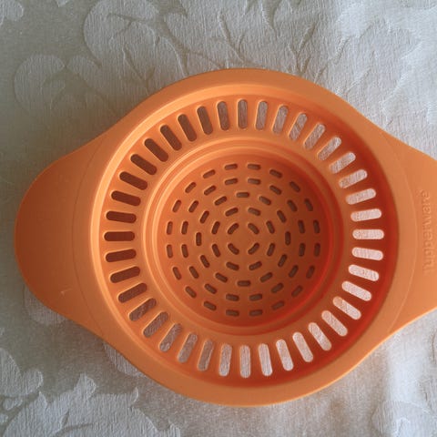 En plastik si fra Tupperware der måler cirka 20 cm i længden. Den består af en blå håndtag og en grøn si eller meldeks, designet til at sigte mel, eller pulver m.v.. Døen har et hul i håndtaget, som gør den nem at hænge op eller opbevare. Den er lavet af plast og er let at rengøre og vedligeholde.