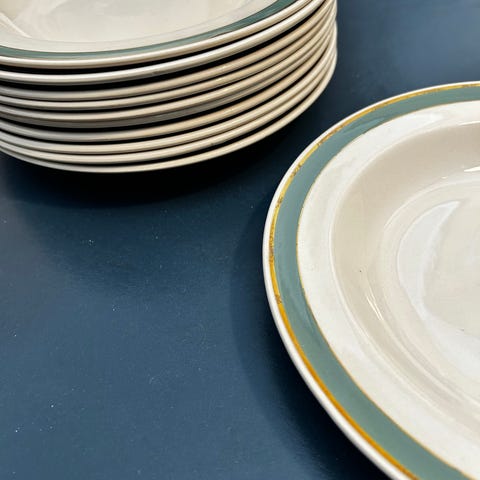 Sættet består af fire keramiktallerkener med en diameter på 26 cm. Tallerkenerne har en elegant kant med mørk og lys stribe, og de er lavet af keramik. Undersiden af tallerkenerne har et mærkat, der indikerer, at de er fra mærket Arabia. Den glatte overflade gør dem velegnede til servering og daglig brug.
