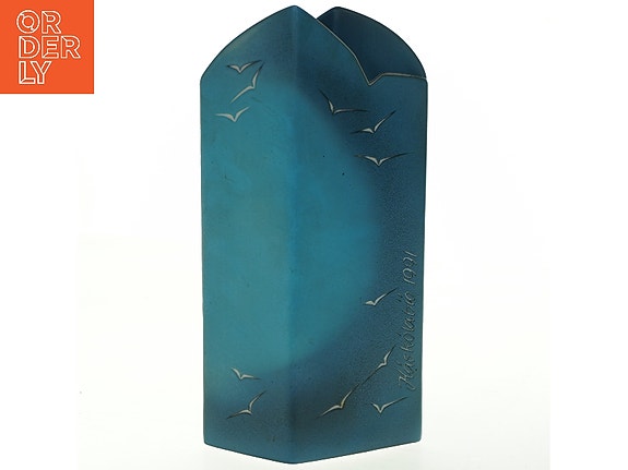 Dette er en metalbeholder med låg, dekoreret med et kunstmotiv på siden. Beholderen er lavet af metal og har en rektangulær form med dimensionerne 9x13x13,5 cm. Den har en lysegrøn farve og er velegnet til opbevaring af små genstande.