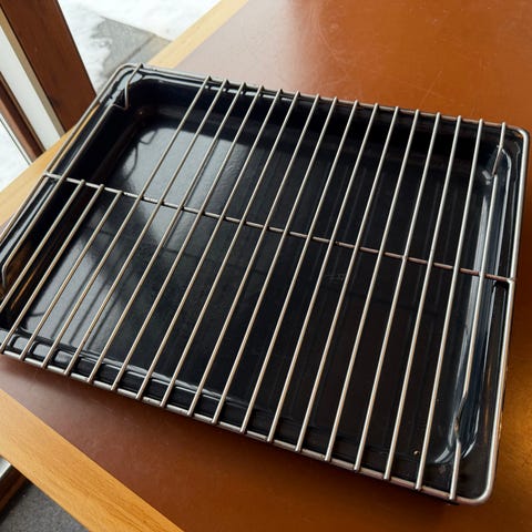 Bradepande med en aftagelig rist, ideel til stegning og bagning. Den har robuste håndtag i metal på begge sider, der gør det let at håndtere. Størrelsen er 41x32x8 cm, hvilket giver god plads til større retter. Let at rengøre og kan bruges i ovnen.