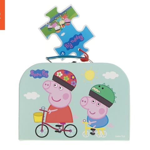 Billedet viser et Peppa Pig puslespil, der er designet til at lære børn om årstiderne. Æsken indeholder flere stykker, som sammen danner billeder med efterår, vinter, forår og sommer temaer. Puslespillet er anbefalet til børn over 3 år og har dimensionerne 19x19 cm.