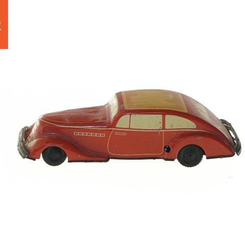 En lille legetøjsbil lavet af metal. Bilen er 6,5 cm lang og har en orange farve med blå detaljer på hjulene og vinduerne. Den har et sporty design med en stor spoiler på bagsiden.