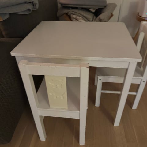 IKEA børnebord og stole sæt i hvid. Sættet består af et rektangulært bord og to stole i børnestørrelse. Møblerne er i et enkelt og funktionelt design med runde kanter og kraftige ben, som giver stabilitet. Egnet til brug i børneværelse, stue eller legeområde til aktiviteter som leg, tegning og spisning.