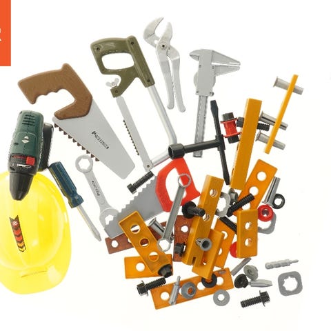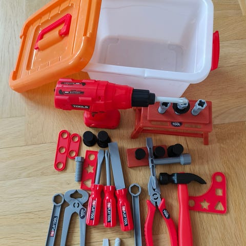 Værktøj til de små med handsker, hjelm, sikkerhedsbriller, sav, vaterpas, skruetrækker, skruer og meget mere