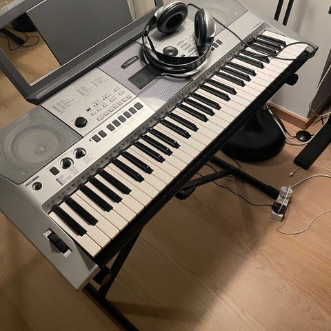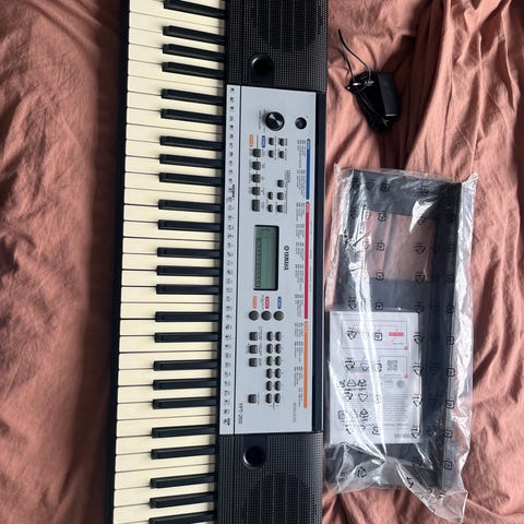 Yamaha sort keyboard, digitalpiano med indbyggede højtaler og flere lyde. Der medfølger X-formet stativ, som kan justeres i højden, samt en strømforsyning.