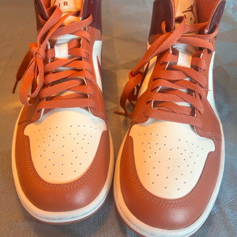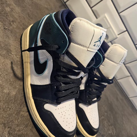 Air Jordan 1 Mid sneakers i størrelse 38,5. Modellen er en high-top sneaker med snørelukning. Skoene er i grå og hvid med lys lilla swoosh-detalje og gummisål. Velegnet som hverdagssko eller fritidssko.