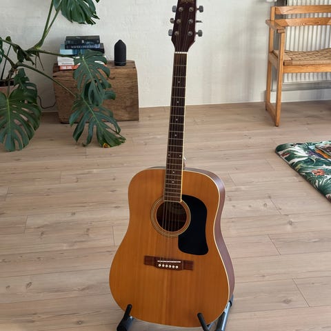 George Washburn D10N akustisk guitar i dreadnought‑form med natur finish. Modellen er en fuldstørrelses western‑guitar med stålsstrenge, sort slagplade og traditionel bro med seks enkeltstående stemmeskruer til strengene. Kroppen er udført i træ med lys top, og gribebrættet er mørkt træ med dot‑indlæg. På indersiden af kroppen ses modelbetegnelsen D10N samt serienummer. Guitaren leveres med blød bærepose/gigbag med lynlås og yderlomme til tilbehør.