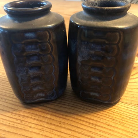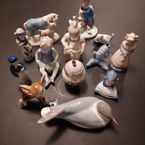 Blandet parti keramikvaser og dekorative buster i forskellige former, størrelser og farver. Partiet omfatter flere krukker og vaser med hank, nogle med mønstrede og malede dekorationer, samt mindre buster og figurer i støbt materiale. Egnet som dekoration i hjemmet, fx på hylder, reoler eller vindueskarme, eller til brug som samleobjekter. Ingen specifik mærkning eller modelangivelse synlig på billederne.