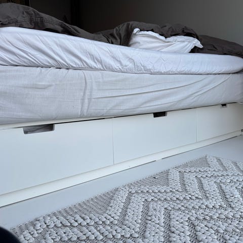 IKEA NORDLI seng med opbevaringsskuffer i hvid. Sengen har integrerede skuffer i soklen, som kan bruges til opbevaring af f.eks. sengetøj, tøj eller andre genstande. Konstruktionen er i hvidt materiale med greb i forkanten af skufferne, så de er lette at trække ud. Velegnet til soveværelse eller gæsteværelse, hvor der er behov for ekstra opbevaringsplads under sengen.