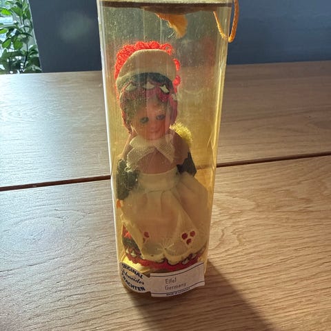 Porcelænsdukke i traditionel folkedragt. Dukken står på en rund fod og er iført rød nederdel med hvidt forklæde og blondekanter samt hvid kyse med sløjfe. Højde ca. 20 cm inkl. fod. Leveres i gennemsigtig cylindrisk plastbeholder med hank, som kan bruges til opbevaring eller udstilling.