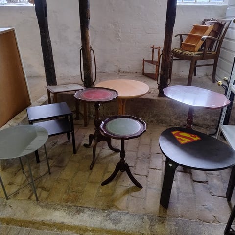 2 mindre borde på metalstel. Bordplade af bøg. Største er usamlet. 72 x 120 x 80 og 72 x 80 x 60 cm.
