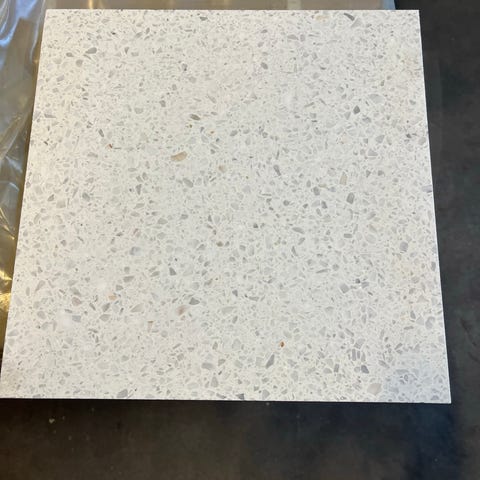 Hvid/Beige Terazzo med små sten som har en sart grållig tone, flisen fremstår varm, helt ny palle med 40x40x1,5 slebet overflade virkelig lækker eksklusiv vare til en skarp pris.