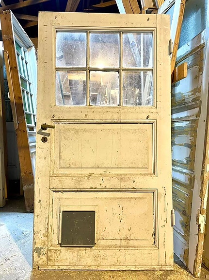Fin og lille toiletdør med rude i matteret råglas. Derudover fine felter på begge sider. Inkl. original karm og bundstykke. Monteret med messinggreb uden rosetter og nøgleskilte.