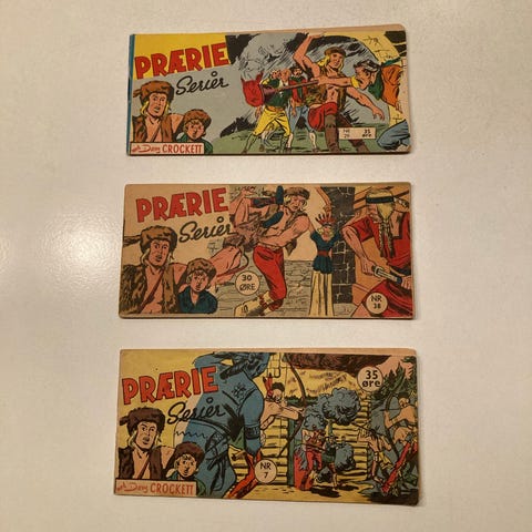 Prærie-Serien og Wild West tegneseriehæfter blandet lot. Samlingen består af flere små hæfter i lommeformat med farverige forsider og westernmotiver. Hæfterne er danske udgaver med prisangivelse i øre på forsiden. Velegnet til samlere af klassiske danske western-tegneserier og ældre tegneseriehæfter. Antal, årgange og eventuelle dubletter fremgår af billederne.