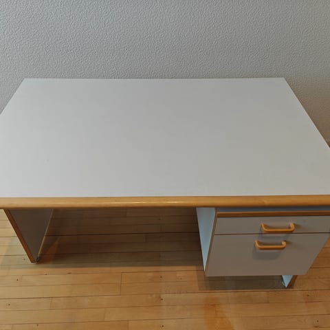Hvidt skrivebord med opbevaring. Bordet har en stor bordplade med kabelgennemføring samt en bred skuffe under bordpladen. I venstre side er der et skab med hylder og en ekstra lille skuffe øverst. Egnet som arbejdsbord eller lektiebord med god plads til opbevaring af kontorartikler og dokumenter.