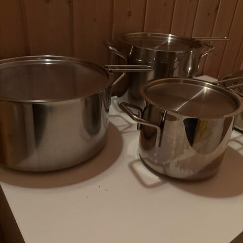 Eva Trio 4 stk gryder. Den store med kobber udvendig måler Ø: 24 cm, H: 8 cm 4,3 L. En gryde måler Ø: 16 cm, H: 13,5 cm 4,8 L. 2 små måler Ø: 16 cm, H: 7,5 cm 1,8 L. De er alle til gas og el sælges samlet ialt