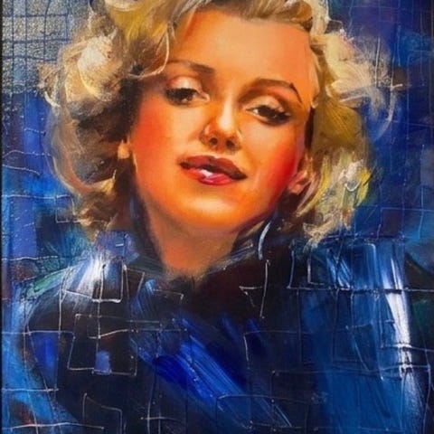 Portrætmaleri på lærred af Marilyn Monroe malet med olie. Billedet er udført i en stiliseret, grafisk stil med stærke kontraster mellem lys og skygge. Farvepaletten er primært sort, hvid, beige og rød. Velegnet som vægdekoration i stue, soveværelse eller andre. Mål 80 x 100 cm