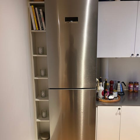 Constructa køle-fryseskab i indbygningsmodel med køl øverst og fryser nederst. Frysedelen er udstyret med tre skuffer, herunder NoFrost-funktion.