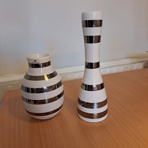 Prisen er lav, idet vasen og den store Lysestage er med få revner i glasuren.. Det er dog ikke noget man kan se i hjemmet, hvis den pæne side drejes ud mod rummet :)