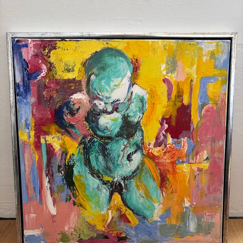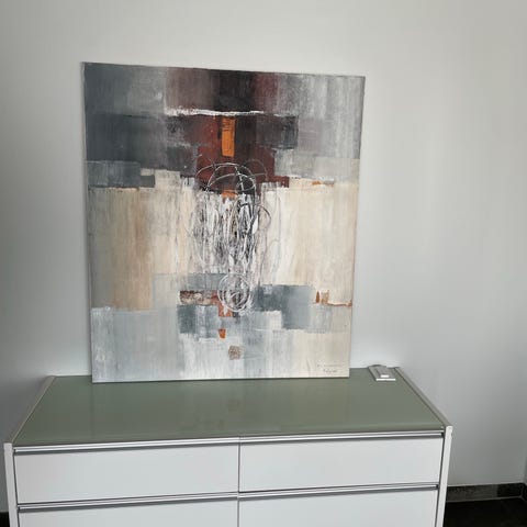 Abstrakt maleri på lærred i stærke, flerfarvede nuancer. Egnet som vægdekoration i stue, kontor eller andre opholdsrum, hvor der ønskes et farverigt og moderne udtryk.
