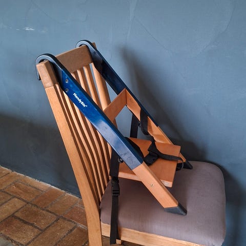Rigtig fin rejsestol til børn. Sættes fast på bordet. Kan klappes sammen og have med i tasken.