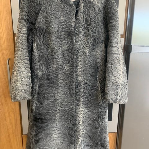 Kirsten Stampe pelsfrakke til kvinder i str. 38. Frakken er i grålige nuancer med mønstret overflade og har krave Lukkes foran og har lange ærmer med detaljer ved ærmekanterne. Velegnet som frakke i koldt vejr.