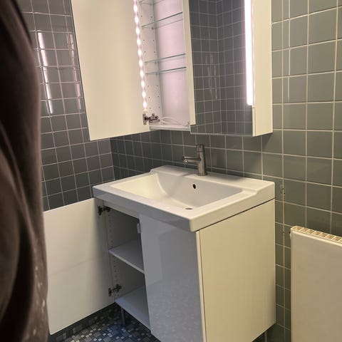 Hvid badeværelsesvask med underskab og integreret spejlskab. Vasken er indbygget i en hvid bordplade med skabe og skuffer under. På hver side af spejlet er der høje opbevaringsskabe med hylder. Over spejlet er der lys, og der er plads til opbevaring af toiletartikler på bordpladen og i skabene. Velegnet til montering i badeværelse med behov for både vask og opbevaringsplads.