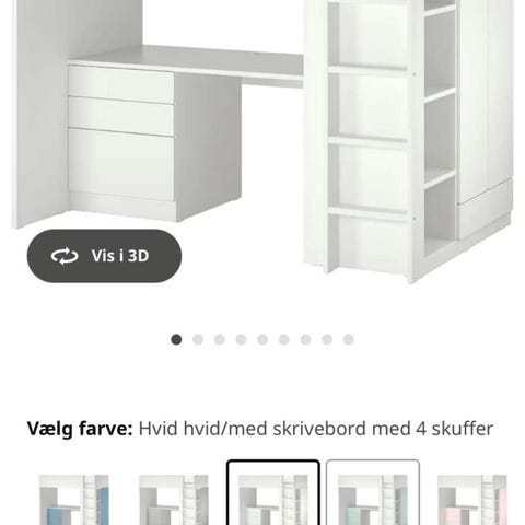 IKEA SMÅSTAD højseng med integreret skrivebord og opbevaring. Højsengen er i hvid med lyserøde fronter på skuffer og skab. Under sengen er der et langt skrivebord samt en skuffesektion med 4 skuffer. I gavlen er der åbne hylder og et skab med låger til tøj eller anden opbevaring. Stigen er fast monteret i den ene side. Velegnet til børneværelse, hvor seng, arbejdsplads og opbevaring samles på lille plads.