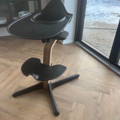 Sælger denne Nomi højstol med babyindsats og plade. Det har brugsspor og et lille hak på pladen i den ene side. Der er taget billede af det. Ellers fejler det intet.