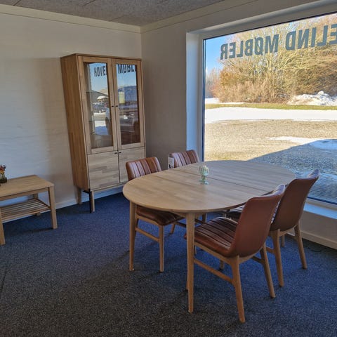 Smukt elegant stuesæt i smoked olieret egetræ med sildeben - der kan købes 2 tillægsplader til spisebordet mod en merpris.