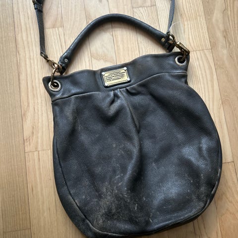 Den ene rem bærer ret synlige brugsspor og skal limes, men ellers har tasken “kun” patina.