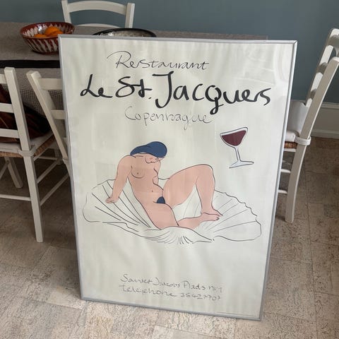 “Restaurant le St-Jacques” Plakat – Peter Kjær-Andersen sælges. I fin stand inklusiv ramme, der nemt kan hænges op. Se mål på de sidste billeder. Plakaten fejler ingenting, rammen har få mærker nederst.