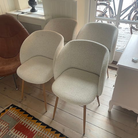 Stolene fremstår fuldstændigt nye, uden nogen pletter eller lign. De er allesammen samlet og anvendt utroligt sparsomt. Nyprisen for stolene var 598 hver. Stolene kan afhentes på Trøjborg☀️