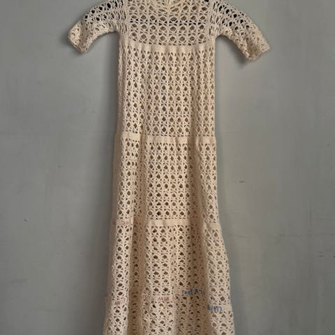 Hjemhæklet, retro dåbskjole, inkl hue. Er i 100% bomuld.