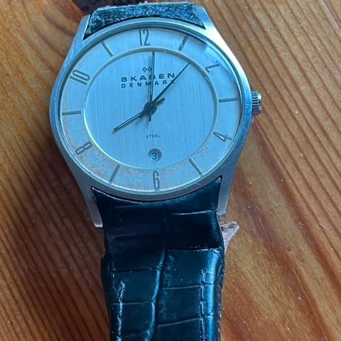 Skagen herrearmbåndsur med rund grå urskive og stållænke. Uret har analog visning med markeringer for timer og minutter samt ekstra små skiver i urskiven. Kassen og lænken er i metal med polerede og børstede led. Velegnet som hverdagsur til mænd, der ønsker et enkelt og klassisk design. Perfekt stand, men skal have nyt batteri.