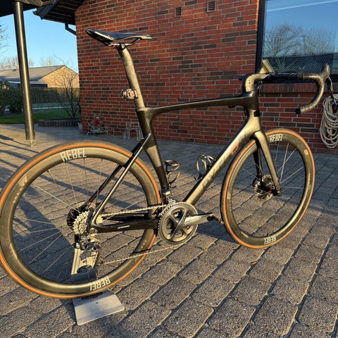 Med shimano ultegra 12speed.di2 med ultegra kranksæt 172.5 . + 1000kr for Magene pes 515 wattmåler og 167.5 krankarme. Rebel royal 45mm hjulsæt ca 1400 gr. med dtswiss lejer. Totalvægt ca 8.2. Sælges uden pedaler.