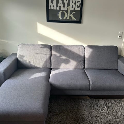 3 personers sofa med chaiselong, 9 år gammel, dejlig siddekomfort, brugsspor på 2 hynder fra børnebørn. Farven er brun/mørk Olivengrøn. Skal hentes på vores adresse d 21 eller 22 februar. Vi kan hjælpe med at skille den ad.