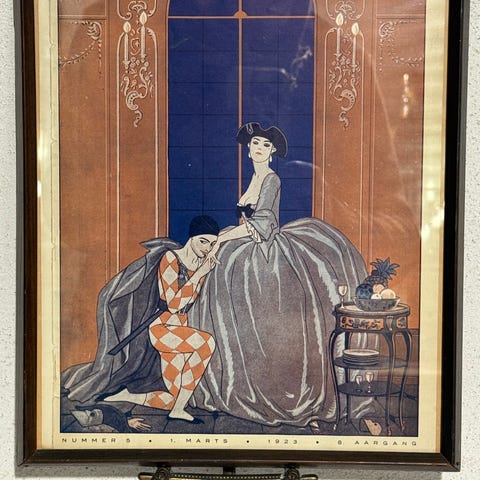Forsiden er indrammet i flot gammel træramme og glas. Dette er IKKE en reproduktion, men en original forside fra et magasin. Mål: ramme: ca. 40x29 cm. Stand: se billeder. OBS! Messing staffeli ikke inkluderet i prisen.