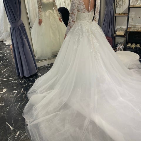 Alt medfølger. “Nederdel” kan tages af så det bliver en simpel tætsiddende kjole. Det vil sige at der er to kjoler i en. Handsker og slør medfølger.