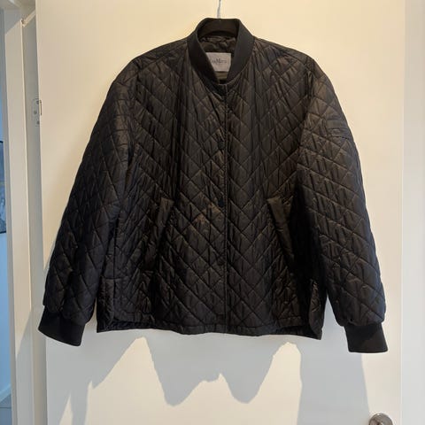 Max Mara Weekend dunjakke til kvinder i str. 40. Jakken er sort og fyldt med dun, markeret som "heavy padding" på indersiden. Modellen har hætte med pelskant, gennemgående lynlås foran og sidelommer med lynlås. Indersiden er lys, hvilket giver en tydelig kontrast til den mørke yderside. Velegnet som varm yderjakke i koldt vejr.