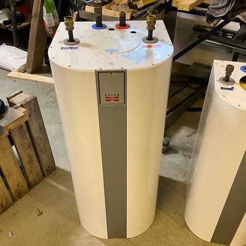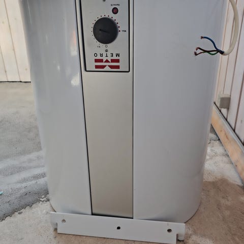 Metro Therm varmtvandsbeholder i hvidt kabinet. 30 liter. Netop taget ned i forbindelse med renovering af køkken - har fungeret fint.